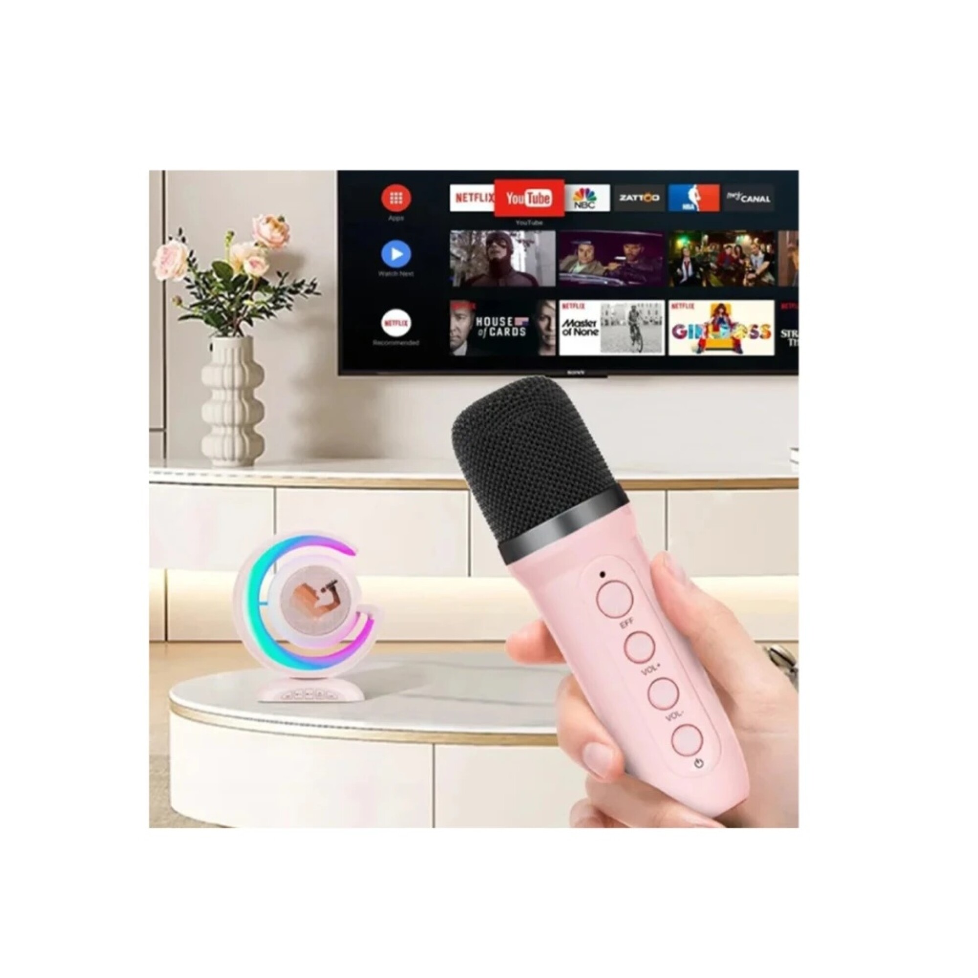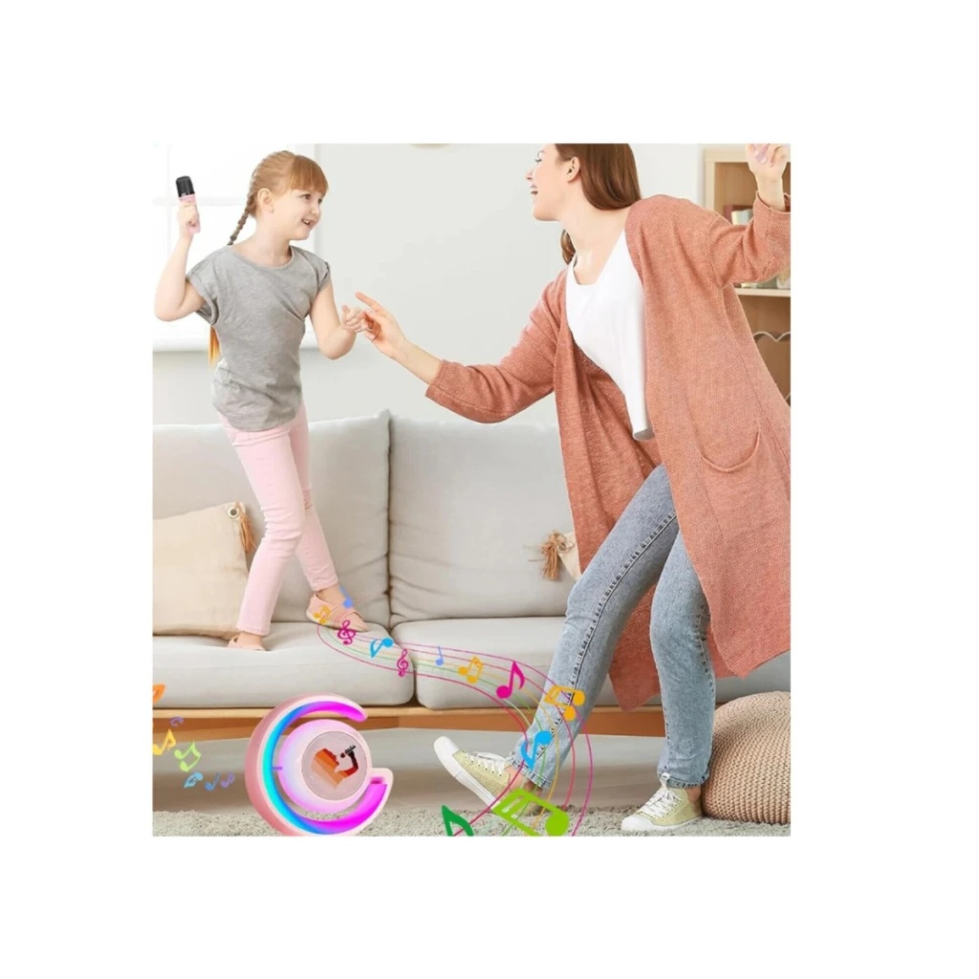 Disfruta de un sonido envolvente y un estilo único con nuestro parlante en forma de G, complementado con un micrófono inalámbrico, todo en un elegante color rosado.
